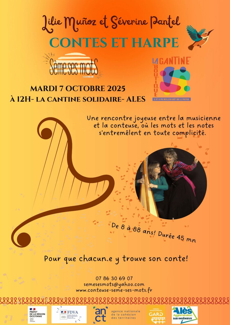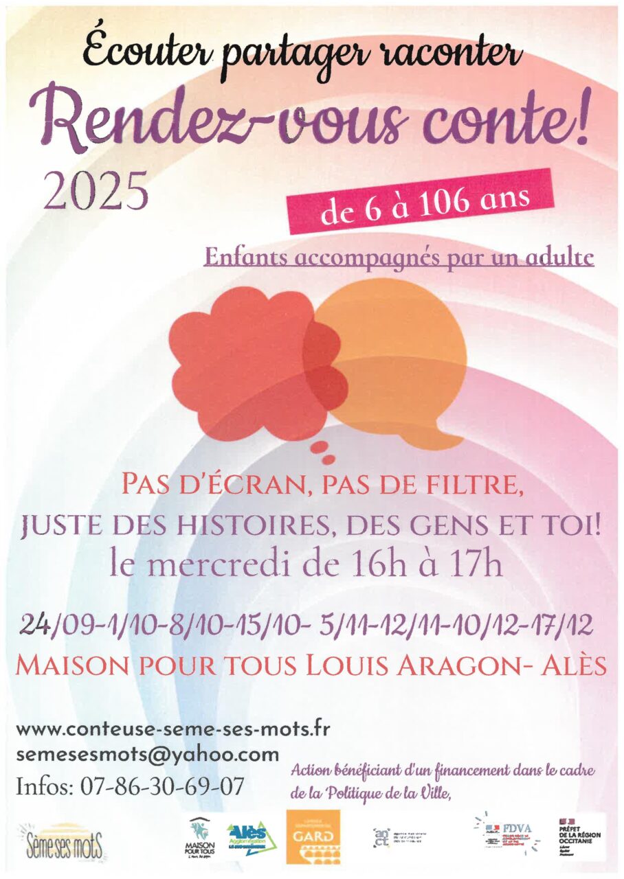 Cercles des conteureuses sur le territoire d’Alès/Cévennes, Rochebelle et Anduze: projet subventionné par la DRAC, le FDVA2, Les Politiques de la ville, le Département du Gard, Alès Agglomération et les communes d’Alès et d’Anduze: plusieurs rendez-vous contes entre septembre 2025 et mars 2026. (2 documents : Cercles de contes à Alès et Flyer sème ses mots)